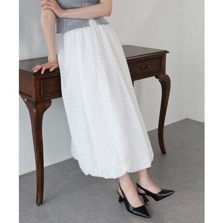 ナチュラルフェミニンなコットンレース×ふんわりと広がるバルーンシルエットが目を惹くロングスカート