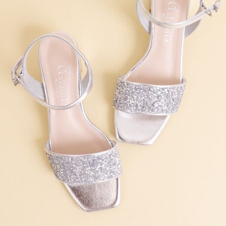 ・つま先側のグリッターストラップはしっかりとした幅で安定感を、アンクルストラップは細めにして足首が華奢に見えるようにこだわりました。
