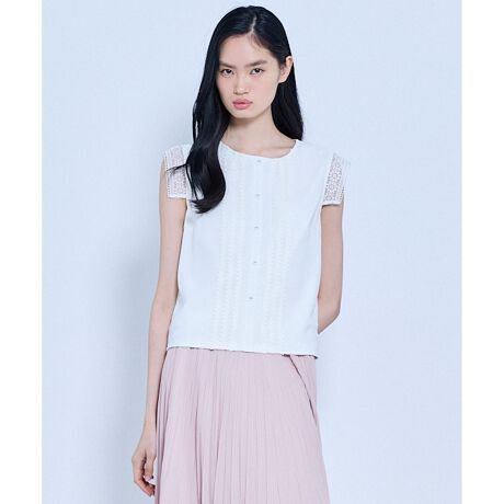 日常から特別な日まで、装いを品よく格上げしてくれる、繊細なレースディテールが印象的な、清潔感あふれるブラウス。フロントには縦ラインを強調するレースをあしらい、甘さを抑えながらも女性らしい華やかさを演出。肩先をやさしく覆うレース袖は、二の腕をさりげなくカバーしつつ軽やかな印象に。コンパクトなシルエットながら、縦のレース使いによりすっきりとした着こなしが叶います。一枚で着映えするデザインなので、パンツにもスカートにも好相性。ジャケットやカーディガンのインナーとしても存在感を発揮し、オン・オフ問わず幅広いシーンで活躍します。きちんと感の中に可憐さを忍ばせた、大人の女性に取り入れていただきたい一枚。