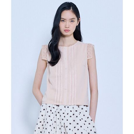 日常から特別な日まで、装いを品よく格上げしてくれる、繊細なレースディテールが印象的な、清潔感あふれるブラウス。フロントには縦ラインを強調するレースをあしらい、甘さを抑えながらも女性らしい華やかさを演出。肩先をやさしく覆うレース袖は、二の腕をさりげなくカバーしつつ軽やかな印象に。コンパクトなシルエットながら、縦のレース使いによりすっきりとした着こなしが叶います。一枚で着映えするデザインなので、パンツにもスカートにも好相性。ジャケットやカーディガンのインナーとしても存在感を発揮し、オン・オフ問わず幅広いシーンで活躍します。きちんと感の中に可憐さを忍ばせた、大人の女性に取り入れていただきたい一枚。