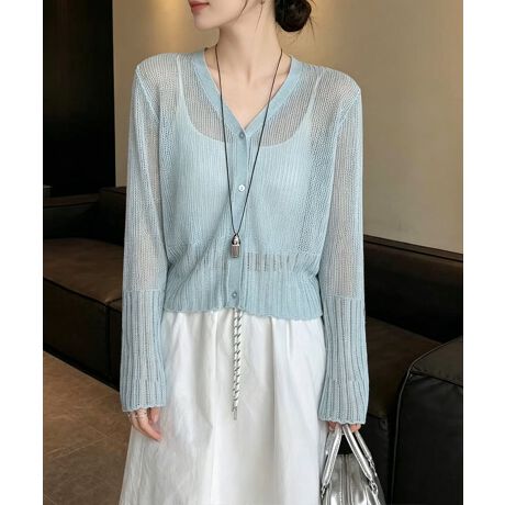 シアー素材で涼しげなVネックのシングルブレストカーディガン。