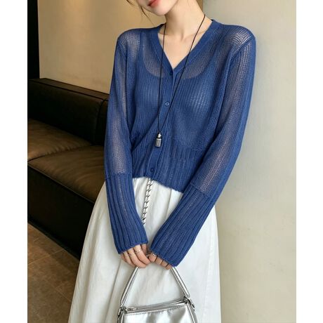 シアー素材で涼しげなVネックのシングルブレストカーディガン。