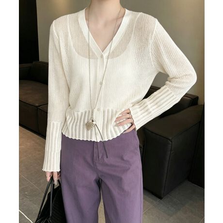 シアー素材で涼しげなVネックのシングルブレストカーディガン。