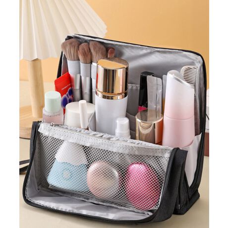 ブラシホルダーやメッシュポケットなど多彩な仕切りで、コスメをすっきり整理。
