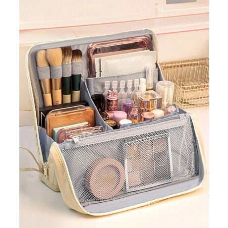 驚きの収納力と自立設計が魅力の多機能メイクポーチ。
