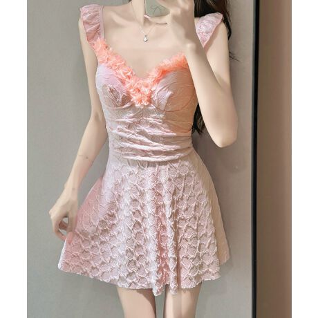 胸元のフラワーディテールと肩フリルが目を引く、ガーリーなワンピース/モノキニの2type水着。