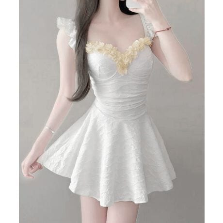 胸元のフラワーディテールと肩フリルが目を引く、ガーリーなワンピース/モノキニの2type水着。
