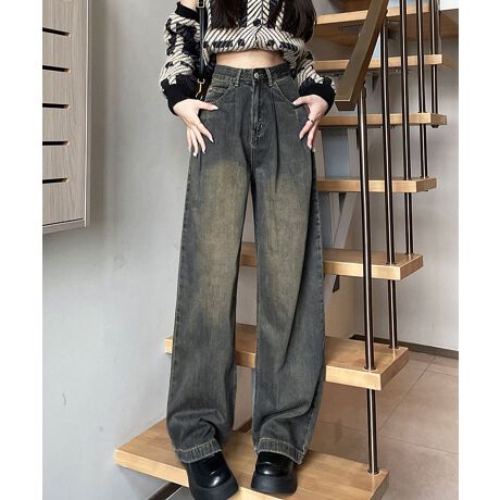 ヴィンテージ加工を施したハイウエストタックワイドデニムパンツ。