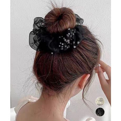 チュールシュシュ パール付きヘアゴム 黒