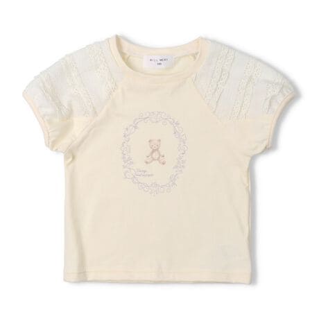 ネットショップと専門店、セレクトショップなどでの限定のアイテム!直営店では直営オンラインショップ「こどもの森e-shop」各店のWEB店限定のみでの販売になります。【直営実店舗での販売はありません。】丸っこい袖とレースが女の子らしい半袖Tシャツ。くまとレースのプリント入り。【アイテム】トップス シンプル ガーリー フェミニン カジュアル お洒落 オシャレ かわいい 可愛い 普段着 デイリーウェア お出かけ着 お外着 お外遊び着 子ども こども 女児 女の子 ガールズ キッズ ベビーサイズ トドラーサイズ 幼稚園 保育園 小学校 通園 通学 小学生 2026年春夏物新作 丸高衣料 オフホワイト 白色 ピンク クマ 動物 アニマル ウィルメリー