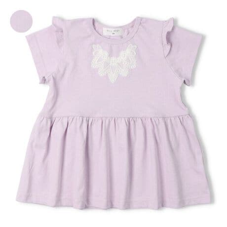 ネットショップと専門店、セレクトショップなどでの限定のアイテム!直営店では直営オンラインショップ「こどもの森e-shop」各店のWEB店限定のみでの販売になります。【直営実店舗での販売はありません。】襟元のレースが可愛らしいアクセントに!肩のフリルもさりげなく女の子らしい。ふんわりシルエットのチュニックTシャツ。綿100%で通園や通学、デイリー使いにもオススメな半袖Tシャツ。【アイテム】トップス シンプル ガーリー フェミニン カジュアル お洒落 オシャレ かわいい 可愛い 普段着 デイリーウェア お出かけ着 お外着 お外遊び着 子ども こども 女児 女の子 ガールズ キッズ ベビーサイズ トドラーサイズ 幼稚園 保育園 小学校 通園 通学 小学生 2026年春夏物新作 丸高衣料 ラベンダー 薄紫色 ウィルメリー