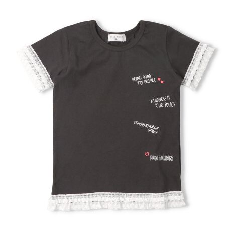 ネットショップと専門店、セレクトショップなどでの限定のアイテム!直営店では直営オンラインショップ「こどもの森e-shop」各店のWEB店限定のみでの販売になります。【直営実店舗での販売はありません。】袖口と裾のレースがポイント!ラフなロゴとハートのプリントがお洒落な半袖Tシャツ。【アイテム】トップス シンプル ガーリー フェミニン カジュアル お洒落 オシャレ かわいい 可愛い 普段着 デイリーウェア お出かけ着 お外着 お外遊び着 子ども こども 女児 女の子 ガールズ キッズ ベビーサイズ トドラーサイズ 幼稚園 保育園 小学校 通園 通学 小学生 2026年春夏物新作 丸高衣料 ブラック 黒色