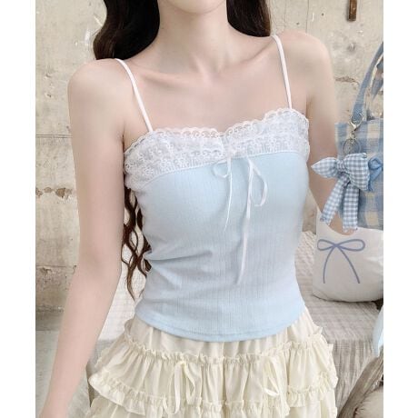 繊細なレースとリボンが可愛らしさを引き立てるカップ付きキャミソール。