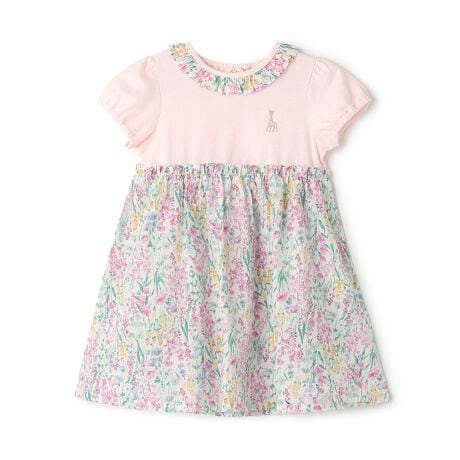 ドビー天竺と小花柄を組み合わせたナチュラルな印象のワンピースです。やわらかなコットン100%素材でやさしい肌当たりに。ウエストの切り替えから広がるシルエットになっており、1枚でコーディネートが決まります。普段着にもお出かけコーデにも使えるアイテムです。内側にお名前を記入できるタグつき。【おすすめの着用時期は春夏シーズン】
