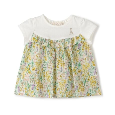 ドビー天竺と小花柄のスカートを組み合わせたナチュラルな印象のチュニックです。やわらかいコットン100%素材を使用し、やさしい肌当たりに仕上げました。胸元のフリルとソフィーの刺しゅうがさりげないアクセント。切り替えから広がるシルエットで、カジュアルにもお出かけにも取り入れやすいアイテムです。内側にお名前を記入できるタグつき。