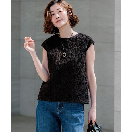 涼し気で軽やかな印象のカットワーク刺繍生地と伸縮性の良いカットソー素材をドッキングしたプルオーバーです。フロントに施された繊細な刺繍が華やかさを演出しつつ、着心地の良さも兼ね備えたデザインです。肩先が隠れる絶妙な丈感のフレンチスリーブで、一枚着としてはもちろんジャケットやカーディガンのインナーとしても重宝します。きれいめなスカートと合わせたフェミニンなスタイルから、デニムやワイドパンツと合わせたカジュアルダウンした着こなしまで、幅広いコーディネートにマッチします。カラーは、清涼感のあるホワイト(#001)、シックで大人っぽいブラック(#005)、肌なじみの良い上品なベージュ(#033)、深みのある落ち着いたトーンのダークブラウン(#035)の4色展開です。
