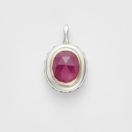 深い赤が魅力のルビーを際立たせるチャームです。ルビーの深い色合いを上品に引き立てる、程よい存在感のゴールドの石枠と、アンティークな趣を添えるローズカットが魅力です。裏面にはシルバーに繊細な透かし模様を施し、正面のシンプルな輝きとのコントラストが美しいアクセントになっています。合わせるチェーンによって表情が変わり、気品の中にもモダンな雰囲気を感じられるルビージュエリーに仕上げています。※ルビーには小さなの傷や黒点があります。予めご了承ください。※天然石や天然素材を使用しているものは、サイズ・色味・風合いの違いや、若干の傷、内包物の有無などに個体差があります。※ルビーには小さなの傷や黒点があります。予めご了承ください。