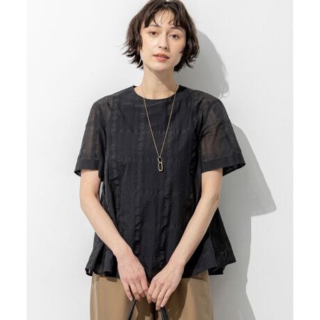 透け感のあるベース生地に同色の糸を使ってチェック柄を表現した空気を含んだようなエアリーなシャドーチェックの素材を使用しています。肌離れの良い適度なハリ感がありシルエットを美しく保ちます。ご自宅でお手入れしやすいイージーケア素材なのも嬉しいポイントです。同色で配した大きめのチェック柄は光の当たり具合で表情感が変わるため派手すぎず、柄物が苦手な方でも取り入れやすくコーディネートに奥行きと高級感をプラスします。