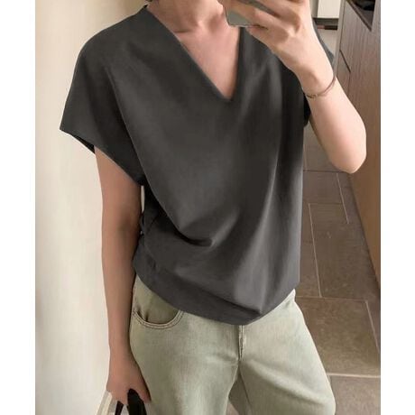 深めに開いたVネックがデコルテラインを美しく見せ、抜け感のあるスタイリングを演出します。