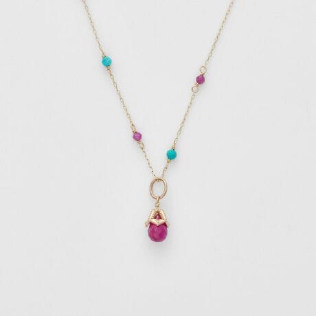 レッドとブルーのやさしい色合いが魅力のネックレスです。バランスよく配置されたカラーストーンが、首元に穏やかな彩りを添えてくれます。取り外し可能なルビーのチャーム付きで、気分やスタイリングに合わせて多彩なアレンジをお楽しみいただけます。※天然石や天然素材を使用しているものは、サイズ・色味・風合いの違いや、若干の傷、内包物の有無などに個体差があります。※ルビーには小さなの傷や黒点があります。予めご了承ください。