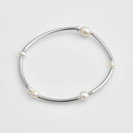 伸縮性があり、着脱もスムーズにできる軽やかな着け心地のゴムブレスレットです。トレンド感のあるパイプデザインに、淡水パールをリズミカルにあしらうことで、地金とのモダンな組み合わせが際立ちます。カジュアルなスタイルにも自然に寄り添いながら、どこかクールで洗練された美しさを楽しめる一本です。※天然石や天然素材を使用しているものは、サイズ・色味・風合いの違いや、若干の傷、内包物の有無などに個体差があります。予めご了承ください。※パールのサイズや形・風合いは1点1点異なります。 ※ゴムは使用頻度により伸びたり劣化する可能性があります。その際はゴム交換が可能です。※熱に弱いため、高温の場所での保管はお控えください。