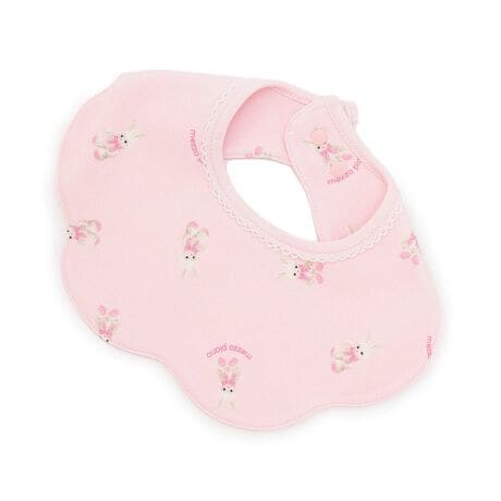 お花のように見えるスカラップの形をしたスタイです。Lピンク土台はうさぎ、エメG土台はネコと土台色によってモチーフの違う総柄プリントしました。首周りはスナップボタンで2段階に調節が可能。お揃い柄の2WAYオール(品番:6262504)とソックス(品番:6262506)を展開しています。MEZZO PIANOデビューにおすすめのセットプレゼントが最適です。
