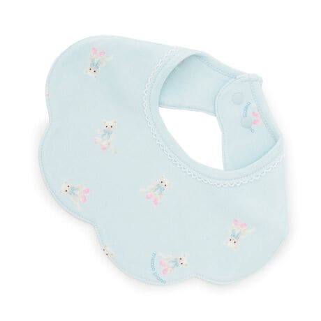 お花のように見えるスカラップの形をしたスタイです。Lピンク土台はうさぎ、エメG土台はネコと土台色によってモチーフの違う総柄プリントしました。首周りはスナップボタンで2段階に調節が可能。お揃い柄の2WAYオール(品番:6262504)とソックス(品番:6262506)を展開しています。MEZZO PIANOデビューにおすすめのセットプレゼントが最適です。