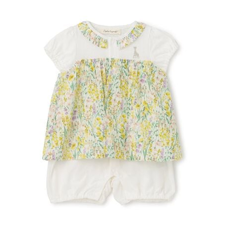 やさしいベースカラーに華やかな花柄が映えるショートオールです。柄部分には凹凸感のあるミラクルウェーブ生地を使用し、軽やかで涼しげな雰囲気を演出しました。スムーズにお着替えできるスナップボタン仕様なのもうれしいポイント。丸みを帯びたパフスリーブが女の子らしさを引き立て、一枚でスタイリングが完成するデザインです。内側にお名前を記入できるタグつき。刺しゅうの裏に「あて布」はございません。【おすすめの着用時期は春夏シーズン】