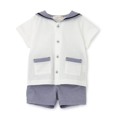 マリンテイストがさわやかな、トップスとパンツのセットアップです。トップスの本体にはやわらかく肌触りの良いコットン100%を使用。配色のセーラーカラーがポイント。フロントにはイカリモチーフのボタンをあしらい、シンプルながらもさりげないアクセントに。ポケットは配色デザインで、全体に程よいメリハリをプラス。ボトムはセーラーカラーとお揃いの軽やかな風合いのショートパンツ。ウエストは総ゴムのため着脱も簡単。デイリー使いはもちろん、お出かけにもピッタリな一枚。【おすすめの着用時期は春夏シーズン】