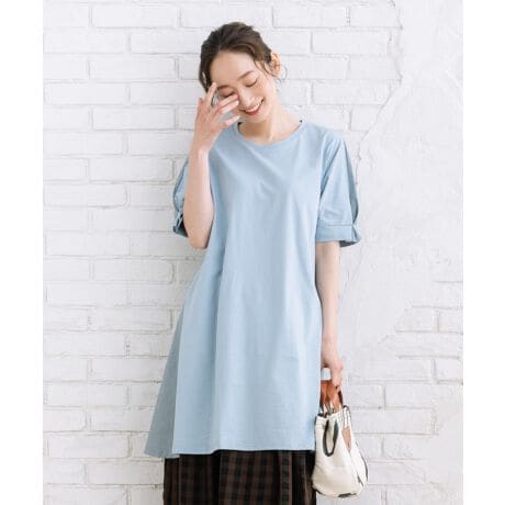 前身頃はシルケットカットソー、後身頃は布帛で切り替えた異素材コンビのチュニック。