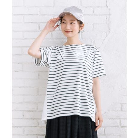 前はボーダーのカットソー、後ろは布帛で切り替えた異素材コンビのカットソー。