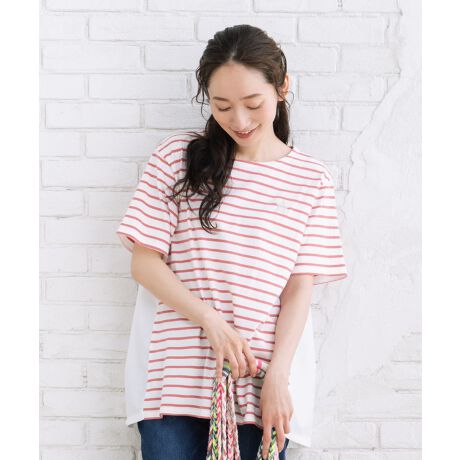 前はボーダーのカットソー、後ろは布帛で切り替えた異素材コンビのカットソー。