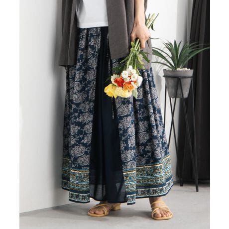 繊細なエスニックプリントが目を引く、存在感のあるロングスカート。