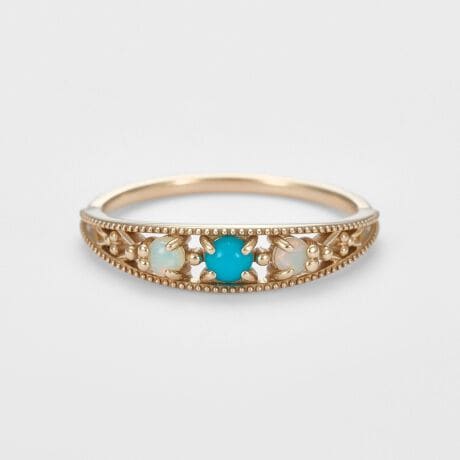 ターコイズとオパールを、アガットらしい繊細な透かし模様で彩ったリングです。肌の色を選ばずに調和しやすいターコイズブルーに、オパールのやわらかな乳白色の輝きを重ねることで、爽やかで上品な表情に仕上げています。長く愛せる洗練されたターコイズジュエリーをお探しの方におすすめのアイテムです。※天然石や天然素材を使用しているものは、サイズ・色味・風合いの違いや、若干の傷、内包物の有無などに個体差があります。予めご了承ください。※オパールは大変柔らかく乾燥に弱い為、取り扱いにはご注意下さい。※サイズ直しプラスマイナス2号迄。