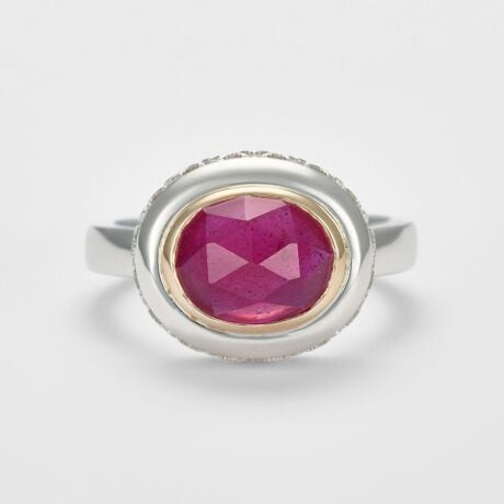 深い赤が魅力のルビーを際立たせるリングです。ルビーの深い色合いを上品に引き立てる、程よい存在感のゴールドの石枠と、アンティークな趣を添えるローズカットが魅力です。裏面にはシルバーに繊細な透かし模様を施し、正面のシンプルな輝きとのコントラストが美しいアクセントになっています。気品の中にもモダンな雰囲気を感じられるルビージュエリーに仕上げています。※天然石や天然素材を使用しているものは、サイズ・色味・風合いの違いや、若干の傷、内包物の有無などに個体差があります。※ルビーには小さなの傷や黒点があります。予めご了承ください。
