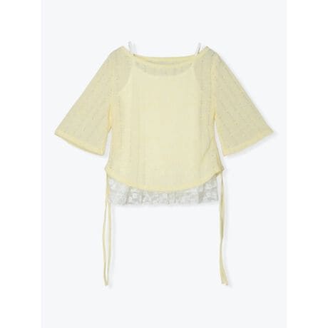 [型番:26560789901]透け感のあるブロークン素材に、裾のレースフリルキャミを重ねたレイヤードトップス。ゆるめのシルエットとサイドリボンが、抜け感のあるバランスをつくります。デニムを穿いてラフにまとめたり、タイトスカートを合わせてコントラストを効かせた着こなしもおすすめ。1枚でスタイリングが決まるアイテムです。