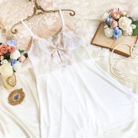 バスト中央にほどこしたパール調のチャームは、クラシカルで洗練された印象をプラス。