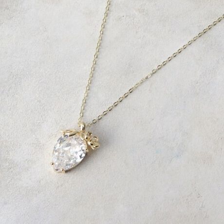 クリアなジルコニアをいちごの形にあしらい、上部には小さな花モチーフとリーフをゴールド調で添えています。
