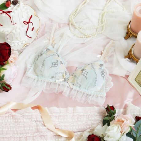 下辺とストラップにはチュールレースを添えて、カップ中央にはブローチ風のアップリケをプラスしました。