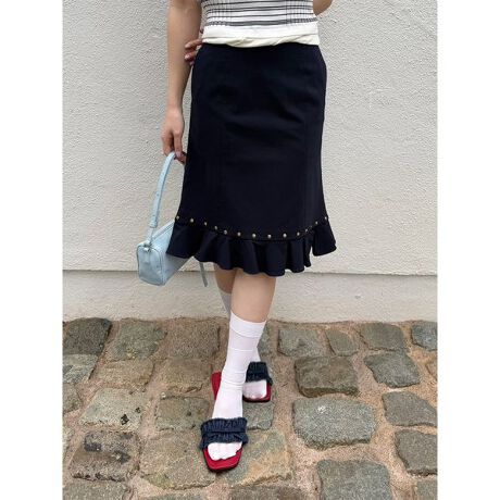 <b>【スタッズの辛口アクセントとフリルの甘さが共演する、モードなミディ丈スカート】