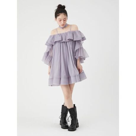 </b>たっぷりのボリュームフリルが目を惹く、ドラマチックなミニドレス。ふんわりと広がる裾のシルエットにこだわり、さらに袖にもラッフルフリルをふんだんにあしらうことで、エアリーで華やかな佇まいを実現しました。袖は肩に乗せても、オフショルダーとしても着用できる2WAY仕様。セットのチョーカーを合わせれば、よりレディで完成度の高いドレスアップが叶います。一枚でパーティシーンを彩るのはもちろん、デニムをレイヤードしたデイリーなミックススタイルもおすすめです。<b>