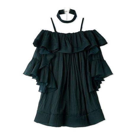 </b>たっぷりのボリュームフリルが目を惹く、ドラマチックなミニドレス。ふんわりと広がる裾のシルエットにこだわり、さらに袖にもラッフルフリルをふんだんにあしらうことで、エアリーで華やかな佇まいを実現しました。袖は肩に乗せても、オフショルダーとしても着用できる2WAY仕様。セットのチョーカーを合わせれば、よりレディで完成度の高いドレスアップが叶います。一枚でパーティシーンを彩るのはもちろん、デニムをレイヤードしたデイリーなミックススタイルもおすすめです。<b>