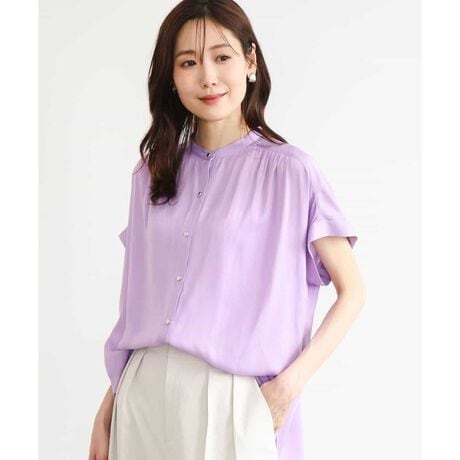 [UVカット/接触冷感/洗える]バンドカラーサテンブラウス