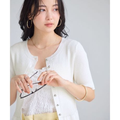 ワイドパンツと相性抜群。デニムから美easyシリーズまで幅広いテイストに合わせやすいカーディガン。前開きですが全て釦を閉じてトップス使いするのがおすすめです。