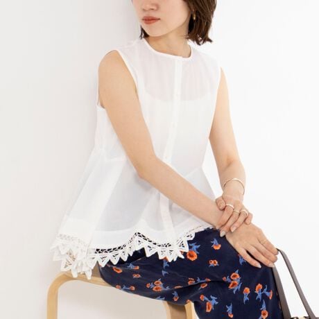 ・程よいハリのコットン・ポリエステル素材を使用したノースリーブのハンカチヘムブラウス