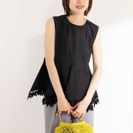 ・程よいハリのコットン・ポリエステル素材を使用したノースリーブのハンカチヘムブラウス