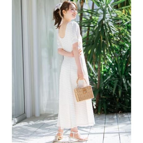 後ろ姿まで抜かりなく魅せるバックオープンフレアカットワンピース【Design】・立体感のある波々のボーダー生地を使ったカットソーワンピース。・大胆に開いたバックオープンデザインが抜け感を演出してくれます♪・袖に施したタックデザインが立体感をプラスし、さりげないアクセントに!・ウエストから広がるフレアシルエットが女性らしく美しいラインを演出します♪・すっきりとしたネックラインでバランスよく着こなせるデザインです!・両サイドポケット付き・被り仕様【Fabric】・伸縮性のある生地なので動きやすく、裏地にはサラッとした素材を使用。・なめらかな肌触りと程よい落ち感で美しいフレアラインをキープします。・ご自宅でお手入れが出来るのも嬉しいポイント♪・ホワイト、ピンク、ラベンダー、ミント、ブラックの5色展開となります。【Care】手洗い可能