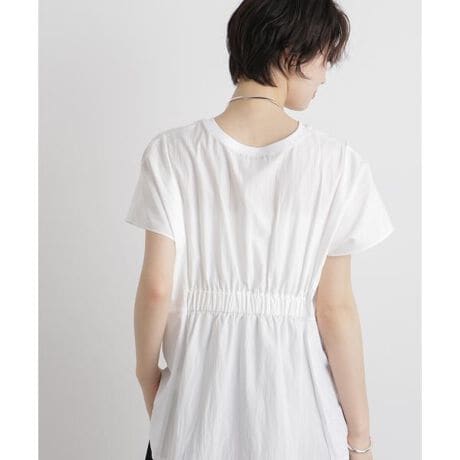 微配色のさりげない異素材使いが、洒落見えするデザイントップス。スクエアシルエットとバックギャザーが生み出す立体感で、抜け感のある着こなしが叶います。リラックス感がありながらも、シャープな印象でオンオフ問わず活躍する一枚です。