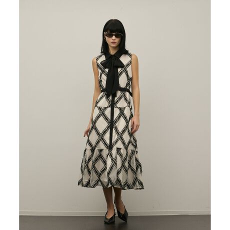 [型番:0126235207]レーステープのような刺繍を施したチュール刺繍レースワンピース。取り外し可能な大きなボウタイも特徴で華やかさ感じるデザイン。※こちらのモデル着用画像はサンプル品を撮影しております。実際の商品と仕様、加工、サイズが若干異なる場合がございます。予めご了承くださいませ。