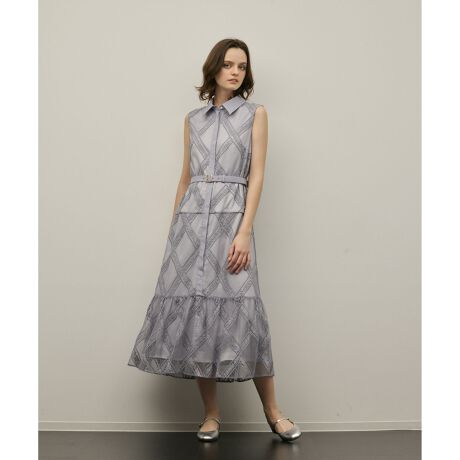 [型番:0126235207]レーステープのような刺繍を施したチュール刺繍レースワンピース。取り外し可能な大きなボウタイも特徴で華やかさ感じるデザイン。※こちらのモデル着用画像はサンプル品を撮影しております。実際の商品と仕様、加工、サイズが若干異なる場合がございます。予めご了承くださいませ。